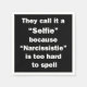 Pour l'amoureux du sarcasme en chacun de nous. Regardez cette version spirituelle "Ils l'appellent Selfie parce que Narcissistie est trop difficile à épeler" sur les vêtements et les cadeaux.