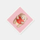 Serviettes en papier avec une jolie illustration aquarelle. Un ours en peluche brun portant un grand coeur rouge. Pois jaune clair sur un arrière - plan rose.