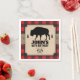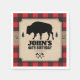 Un arrière - plan de plaid de buffle rouge contraste avec un panneau d'apparence en papier kraft sur cette serviette à thème Northwoods. Le panneau contient le texte et comporte un bison (buffle) entre deux pins. La hache croisée fait un logo personnalisé ci-dessous. Un grand ajout à un anniversaire, une fête de baccalauréat, un événement saisonnier, un plaid de bison ou une fête de bûcheron. Disponible avec des produits correspondants.
