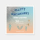 Le texte "RETRAITE HEUREUSE" a des couleurs bleu brillantes et est écrit en vagues comme la mer. Il y a quatre caricatures de coquillages bleus sur un arrière - plan pêche/orange clair ressemblant à la plage et au sable de l'océan. Il y a deux photographies d'étoiles de mer sur le côté droit. L'arrière - plan a une parties scintillant argentée sur le côté et un arrière - plan bleu clair et pêche/orange clair. L'arrière - plan est le mien. Vous pouvez le modifier avec les outils Zazzle. Personnalisation : le nom, le numéro 30 et le texte "années de service" et la date peuvent être customisés avec vos informations. Elles sont écrites dans des tons blancs.