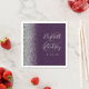 Le bord gauche de ces élégantes serviettes mariages modernes présente un style de parties scintillant en faux argent. Le texte personnalisable combine écriture gris argenté et polices de caractères sur un grand écran sur un arrière - plan violet foncé.