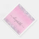 De jolies serviettes glamour et monobloc girly pour sa fête d'anniversaire ou d'autres occasions spéciales avec des confettis holographiques brillants violet, rose et argent faux parties scintillant sur le dessus et le bas contre un arrière - plan rose et son nom dans un script gris doux et tendance avec des swashes.