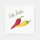 Serviettes en papier à thème Fiesta avec graphiques d'un piment rouge et jaune. Le texte vert personnalisé lit Lets Fiesta et peut être personnalisé pour lire ce que vous voulez. Les invitations et les fournitures de la partie correspondante sont disponibles.