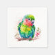 Serviettes en papier avec une jolie illustration de perroquet. Un petit perroquet vert aux couleurs bleu et jaune se mélangeant. Le cou a une teinte vif de rose rougeâtre.