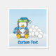 Un petit dessin de pingouin assis et tenant une boule de neige. Texte personnalisé.