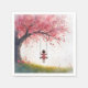 Une jeune fille en robe rose est assise sur une balançoire accrochée à un cerisier en fleurs.