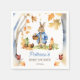 Pierre lapin chute baby shower vaisselle personnalisées serviettes de fête en papier, un mignon lapin aquarelle avec une veste bleue tenant cornet de chênes de tournesol feuilles jaunes, joli décor de table pour votre baby shower serviettes personnalisées.