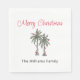 Plage tropicale Joyeuse serviette de Noël, avec une illustration de palmiers et typographie de script. Avec le lettrage personnalisable, vous ajoutez vos propres informations. Un ajout festif à votre table de dîner de destination de vacances.
