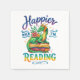 Design coloré et dynamique, avec un livre ouvert, un dragon coloré et des fleurs. Le texte coloré dit : "Plus heureux quand je lis". Ce design est disponible sur une grande variété de produits.