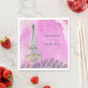 Serviettes en Aquarelle rose pour votre Quinceanera à thème parisien. Cette belle décoration est ornée de l'élégante tour Eiffel décorée avec des accents floraux de fleurs dorées esquissées. La Tour Eiffel se dresse au-dessus d'un emblématique champ de fleurs de la Lavande française contre un arrière - plan d'aquarelle rose. Le modèle est mis en place pour que vous puissiez ajouter le nom de la Quinceanera. Le libellé, dans la typographie de la lavande foncée, se lit "Quinceañera en l'honneur de [nom]". Les serviettes ont un thème coloré de rose lilas mou, or rose et lavande foncée. Consultez notre collection de quinceanera Tour Eiffel pour coordonner les invitations et les fêtes parisiennes.
