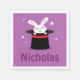 Une serviette en papier avec un petit lapin blanc dans un casquette magicien. Il y a des étoiles et une baguette. Nom personnalisable