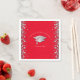 This modern design features a graduation hat and confetti in silver on a background of red with white text.