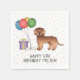 Design à thème d'anniversaire mignon avec le dessin original de Destei de l'illustration d'un mignon chien de race Goldendoodle en couleur rouge. A côté du chien il y a des ballons colorés d'anniversaire attachés sur un os de chien et une boîte cadeau de couleur violet et jaune. L'arrière - plan a un motif ludique de confettis pastel colorés sur un arrière - plan blanc. Vous trouverez également une zone de texte personnalisable.