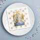 Retro graduation with grad caps in shades of blue and gray with white flowers against a light peach background. Colors can be customized to your choosing. Photo template via Pixabay licensed under CC0 and must be replaced with your own photo.