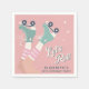 Des serviettes d'anniversaire pour le patinage à rouleaux roses mignonettes avec une illustration retro de patins à rouleaux bleus turquoises sur une fille portant des chaussettes à tubes à rayures roses et "Let's Roll" dans un script style années 70. Ajoutez son nom de typographie bleu turquoise foncé.