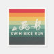 La serviette de cocktail de motivation sportive inspirée par Retro affiche les trois icônes d'événement sportif les plus reconnaissables au-dessus de l'en-tête "SWIM ・ BIKE ・ RUN". Arrière - plan à bande arc-en-ciel rétro gras. Parfait pour un entraînement moyen ou une fête post-course.