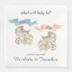 Ce genre de bébé personnalisé révèle des serviettes de fête avec un design d'aquarelle à l'ancienne. Une image d'un chariot de style vintage est imprimée de chaque côté de l'invitation. Un bébé lapin en peluche est assis devant le chariot. Le côté gauche est orné d'un ruban bleu avec le titre "GARÇON", et le côté droit d'un ruban rose avec le titre "fille" imprimé dessus.