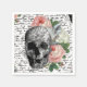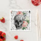 Dentelle crâne avec roses sur blanc avec écriture noire.