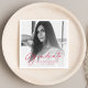 Ajoutez une touche personnalisée à votre fête de remise de diplômes avec nos serviettes de remise de diplômes photo personnalisées! Les serviettes en papier de fin d'études affichent la photo du diplômé avec "Graduate" dans une superposition de script rouge moderne et un dégradé blanc optionnel. Personnalisez les serviettes photo de diplôme en ajoutant le nom du diplômé et l'année de diplôme.