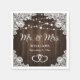 Décorez votre fête de mariage rustique avec ces serviettes en papier romantique M et Mme mariage, avec des coeurs entrelacés contre un arrière - plan en bois rustique orné d'élégantes dentelles florales et de lampes à cordes.