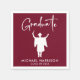 Serviettes rouges bordeaux personnalisées pour sa fête de remise des diplômes avec l'illustration d'un diplômé masculin célébrant dans son casquette et sa robe, "Graduate" dans un script blanc moderne et son nom et année de classe dans une simple typographie blanche.