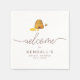 Serviettes personnalisées Bride to Bee. Ce panneau de bienvenue de style campagnard est conçu avec une ruche de style aquarelle avec une abeille volante et du miel qui coule. Le fond du design est réglé sur blanc, mais il peut être changé en n'importe quelle couleur que vous préférez.