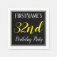 Cette conception simple et élégante de serviette en papier comporte un message comme "la 32e fête d’anniversaire de FirstName", avec le "32e" dans un texte de couleur jaune soigné, dans une zone carré de couleur noire avec un contour de bordure simple. Le nom peut être personnalisé. Des serviettes comme celles-ci pourraient être utilisées à une fête d'anniversaire pour quelqu'un qui célèbre son trente-deuxième anniversaire. [~Z0000150]