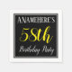 Cette conception simple et élégante de serviette en papier comporte un message comme "AnameHere’s 58th Birthday Party", avec le "58th" en texte jaune raffiné, dans une zone carré de couleur noire avec un contour de bordure simple. Un nom personnalisé peut être utilisé. Des serviettes comme celles-ci pourraient peut-être être utilisées à une fête d'anniversaire pour quelqu'un qui célèbre son cinquante-huitième anniversaire. [~Z0000150]