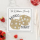 Ces serviettes personnalisées de fête ont un thème de nuit de jeu sophistiqué et glamour. Une grande image de dés de parties scintillant d'or est placée au centre. Il est parfait pour votre prochain tournoi de bunco. Un exemple de nom de famille est imprimé en haut, que vous pouvez personnaliser pour inclure votre propre nom ou texte personnalisé.