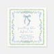 Chic bridal shower napkins featuring vintage grandmillenial-inspired green scallop and blue floral watercolor frames, a delicate blue coquette bow watercolor, "something blue before I do" showcased in an elegant blue calligraphy script, and the name of the bride and shower date in classic serif typography.