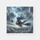 Une sorcière traverse un balai dans un ciel nocturne orageux accompagné d'un chat noir et entouré de nuages tourbillonnants et d'éclairs