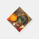 Des serviettes en papier avec la photo d'une récolte d'action de grâce, disposées sur une table en bois rustique. Citrouille, pommes de terre, courge etc... composent cette belle collection de nourriture. Des feuilles d'automne colorées entourent le panier de la cornucopie.