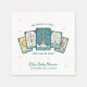 This tarot themed baby shower napkin features a five-card spread with hand-drawn illustrations of The Sun, The Star, The Baby, The Moon, and The Chariot, each reimagined with sweet baby motifs like a rattle, bottle, and carriage. The message reads “The future is clear... the baby will soon be here,” with space below to personalize the event name and date. Light twinkles and star accents in the background add a magical touch to your table setting. A perfect match for celestial baby shower invitations, magical baby shower aesthetic, tarot inspired showers, and Halloween baby shower ideas. Designed to coordinate with other items in the tarot baby shower collection.