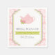 Tea party théière et damas motif rose, mariage vert napkin en papier marie avec une théière rose avec un motif floral blanc de fleurs de pivoines, une bannière vert citron, un cadre et rose, blanc damassé motif. Ce design moderne et élégant est un modèle entièrement personnalisable, idéal pour un mariage de printemps, été ou automne/automne, une douche nuptiale, une réception, un fiançailles ou une fête d'anniversaire. Texte en gris et blanc.