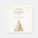 A white background. Decorated with a snowcovered pine tree and faux gold sparkles, snow. Merry Christmas is written with an elegant hand-lettered style script. Personalize and add your family name