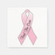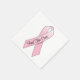 Ruban de sensibilisation au cancer du sein rose sur une serviette blanche "Trouvez le remède" idéal pour les déjeuners de collecte de fonds en octobre.