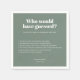 Qui aurait deviné ces choses sur la mariée et le marié ? Design moderne avec typographie audacieuse en vert et blanc sage tendance pour ces mariages faits amusants serviettes : Remplir vos propres noms, date et faits amusants sur votre relation et surprendre vos invités mariages. Supprimez la dernière zone de texte pour faire de la place pour des faits encore plus amusants sur cette serviette. Toutes les couleurs peuvent également être modifiées.
