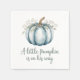 aquarelle illustrant un citrouille bleu-gris clair avec une tige brune et des fleurs délicates de l'haleine de bébé disposées autour de son sommet. Le citrouille a une texture douce et mate avec des ombres et des reflets subtils. Les tiges respirantes du bébé sont peintes dans une couleur beige clair avec de petites fleurs blanches groupées le long. Des feuilles verts sont dispersés dans tout l'établissement. Sous le citrouille, il y a un texte cursif en gris muet qui dit "Un petit citrouille est en route". Le texte est centré et a un style fluide et élégant. L'illustration entière est placée contre un arrière - plan blanc pur. Le citrouille occupe environ les deux tiers de la hauteur de l'image, tandis que le texte occupe le tiers inférieur. L'ensemble est d'une esthétique douce et féminine avec une palette de couleurs muettes dominées par le blues, les beiges et les verts.
