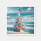 Un sapin blanc de Noël orné de décorations bleues et rouges se dresse sur une plage de sable, surmontée d'un drapeau américain