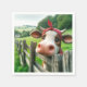 Une jolie vache aux grands yeux expressifs porte un bandana rouge et se penche sur une clôture en bois dans un cadre bucolique verdoyant et verdoyant.