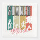 Summer Vibes - pour l'été. Faisons la fête. Cette image vibrante exsuce "Summer Vibes" avec une esthétique rétro. Le mot "SUMMER" est audacieusement affiché en haut en grandes lettres noires et blanches, chaque lettre étant placée sur une bande verticale de couleur différente : turquoise, beige, jaune et rouge. Ci-dessous, le mot "Vibes" est écrit dans une police ludique et cursive en blanc avec un contour rouge. L'arrière - plan de l'image est divisé en trois sections, chacune présentant une activité estivale différente en silhouette : une personne faisant du vélo sur la bande turquoise, un surfeur surfant sur la bande beige, et un coureur sur la bande jaune. La bande rouge présente une scène fantaisiste avec un croissant de lune, des étoiles et une montagne, ajoutant une touche d'aventure et de divertissement nocturne au thème de l'été. Cette image capture l'essence d'un été actif et aventureux, le rendant à la fois visuellement attrayant et évocateur de journées chaudes et ensoleillées remplies d'activités de plein air.