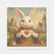 Fall in love with this charming and unique take on the White Rabbit from Alice in Wonderland! This delightful illustration portrays a cute, anthropomorphic white rabbit seated at a rustic table, holding a heart-adorned invitation or card. Dressed in a whimsical red and green outfit, he's ready for a tea party in an enchanting landscape dotted with fairytale castles, colorful banners, and blooming flowers. Teacups and a cake complete this sweet and imaginative scene, perfect for fans of Alice in Wonderland and anyone who adores whimsical, heart-filled art.