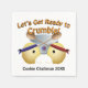 Ce design léger présente quelques personnages de biscuits drôles et féroces qui font face à un bol de mixage et à des cuillères en bois croisées sous une image en arc de texte : "Préparons-nous à tomber en miettes !" Il est facile de customiser pour votre événement de gâteau.