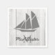Serviettes de cocktail en papier nautique parfaites pour un bar à domicile avec une silhouette de voilier gris sur des planches en bois blanc clair et vos textes monogrammes personnalisés.