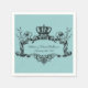 Des serviettes jetables en papier, parfaites pour la réception de mariage, la douche pour couple ou le dîner de répétition, présentent une conception royale de parchemins, de feuilles et de couronne royale avec une zone où vous pouvez ajouter les noms de la mariée et du marié et la date du mariage, le tout sur un arrière - plan bleu.