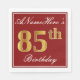 Cette conception simple et élégante de serviette en papier comporte un message comme "AnameHere’s 85th Birthday" (avec le "85th" ayant une fausse couleur dorée) dans une zone carré de couleur rouge avec un contour de bordure simple. Le nom est dans un texte de type script de couleur blanche, et peut être personnalisé. Des serviettes comme celles-ci pourraient peut-être être utilisées à une fête d'anniversaire pour quelqu'un qui célèbre son quatre-vingt-cinquième anniversaire. [~Z0000138]