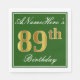 Cette conception simple et élégante de serviette en papier comporte un message comme "AnameHere’s 89th Birthday" (avec le "89th" ayant une fausse couleur dorée) dans une zone carré de couleur verte avec un contour de bordure simple. Le nom est dans un texte de type script de couleur blanche, et peut être personnalisé. Des serviettes comme celles-ci pourraient peut-être être utilisées à une fête d'anniversaire pour quelqu'un qui célèbre son quatre-vingt-neuvième anniversaire. [~Z0000137]
