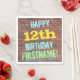 Cette conception amusante de serviette en papier sur le thème de l'anniversaire comporte un message comme "HAPPY 12th BIRTHDAY, FIRSTNAME!", où le nom peut être personnalisé. L'arrière - plan est représenté par un mur en brique composé de briques de couleur rougeâtre. Le texte du message personnalisable comporte des couleurs comme le bleu, le jaune et le vert, et il a un aspect inspiré de celui des graffitis peints. Des serviettes comme celles-ci pourraient être utilisées à une fête d'anniversaire pour quelqu'un qui célèbre son douzième anniversaire. [~Z0000271]