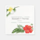 serviettes en papier mariage avec feuillage tropical luxuriant et de beaux accents floraux en rouge, jaune et blanc éclatant. Utilisez le modèle fourni pour customiser vos noms et votre date de mariage. Cherchez ID475 pour voir d'autres produits avec ce design, y compris les invitations de mariage assorties et plus encore.