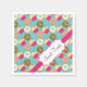 Cette serviette en papier présente un cupcake et un motif de beignes sur un arrière - plan bleu turquoise. Un cadre tourbillonnant blanc avec une bordure rose vif près du fond de la serviette a un texte personnalisable qui dit : Sweet Traitements.